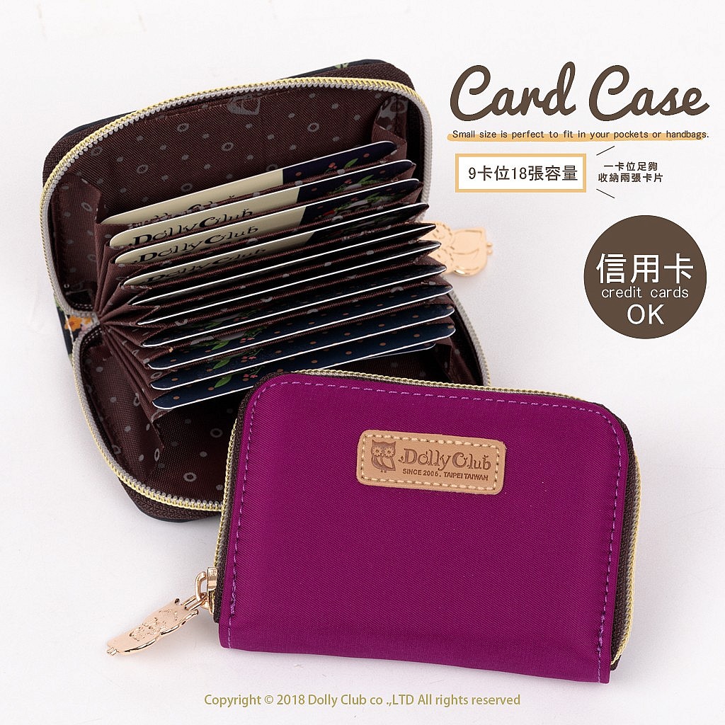 9個卡位(單卡位可收納2張卡片)+2個收納小格 信用卡/名片都適用 輕便卡片收納 SMALL&COMPACT: Very small size - 4.33" *2.76"*0.98"(11*7*2.5 CM).Zip around desig- ned wallet keep your cards, cash and coin- s safe.  Accordion card slots organize your cards  well. LARGE CAPACITY: The card wallet has 9  card slots (holds 9-18 cards) and 2 cash slots inside. It is enough room for your ID card, credit cards, gift cards and dicounted cards.  Small size is perfect to fit in your pockets  or handbags.